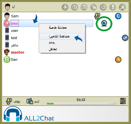 كما يمكن اختيار من يستطيع ارسال الكاميرا :