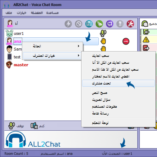 يمكن التحدث المشترك في غرفة الدردشة ويتم عن طريق أحد المشرفين حصرا وذلك بأن يقوم المشرف باختيار الشخص المطلوب مع المتحدث الحالي واختيار ( تحدث مشترك ) من قائمة خيارات المشرف