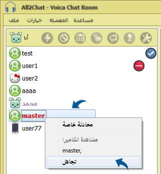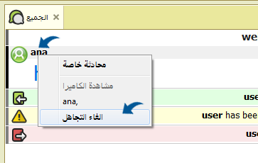 كما يمكن اعطاء تجاهل لاسم مستخدم عن طريق كلك على الاسم من الشات العام او البرايفت واختيار من القائمة خيار تجاهل