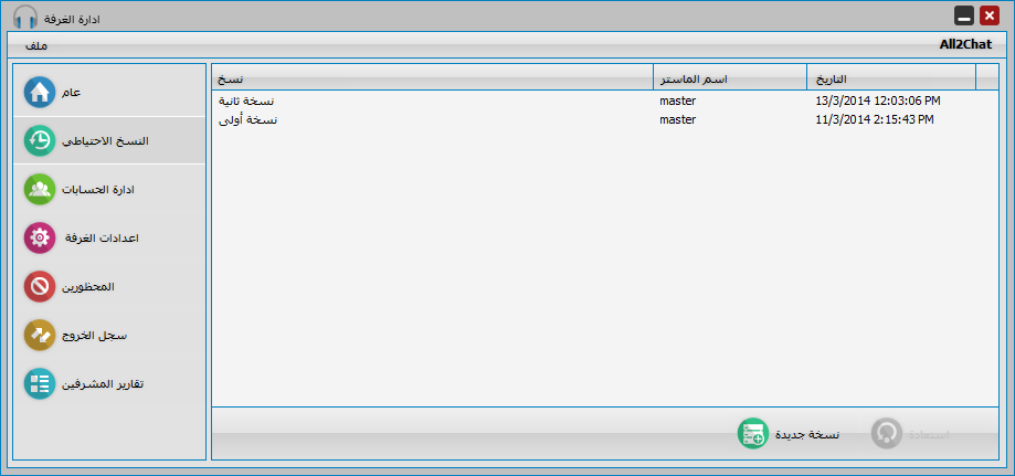 هذا القسم متاح للماستر الاساسي فقط ويمكن عن طريقة اخذ نسخة احتياطية من قاعدة بيانات الغرفة وتشمل :