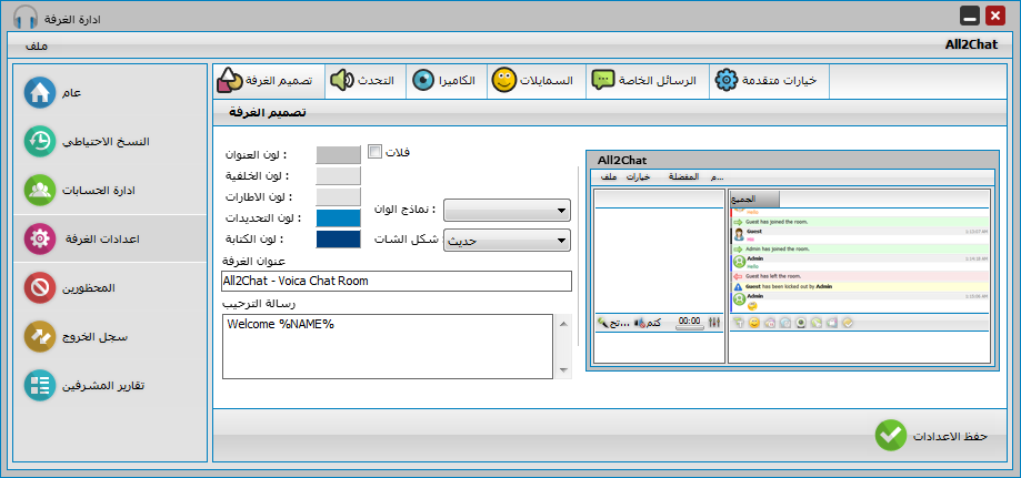 يوجد في برنامج الدردشة نوعين من شكل الشات الكتابي ويمكن لاي ماستر له صلاحيات التحكم بالاعدادات من تغيير الشكل ويتم تطبيق الاعدادات فورا دون الحاجة للخروج والدخول من جديد