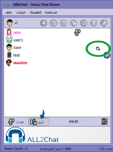 عند عدم الرغبة بسماع صوت المتحدث الحالي يمكن الضغط على زر كتم لالغاء الصوت