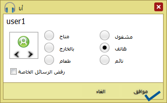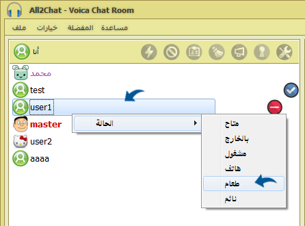 يمكن تغيير الحالة الشخصية الى 6 حالات : متاح , بالخارج, مشغول, على Mobile, اتناول طعامي, نائم ويمكن تغيير الحالة من مكانين الأولعن طريق كلك يمين على الاسم ثم اختيار الحالة